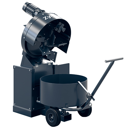 Mit hydraulisch hochklappbarem Getriebearm, abnehmbarem Mischteller und Transportwagen